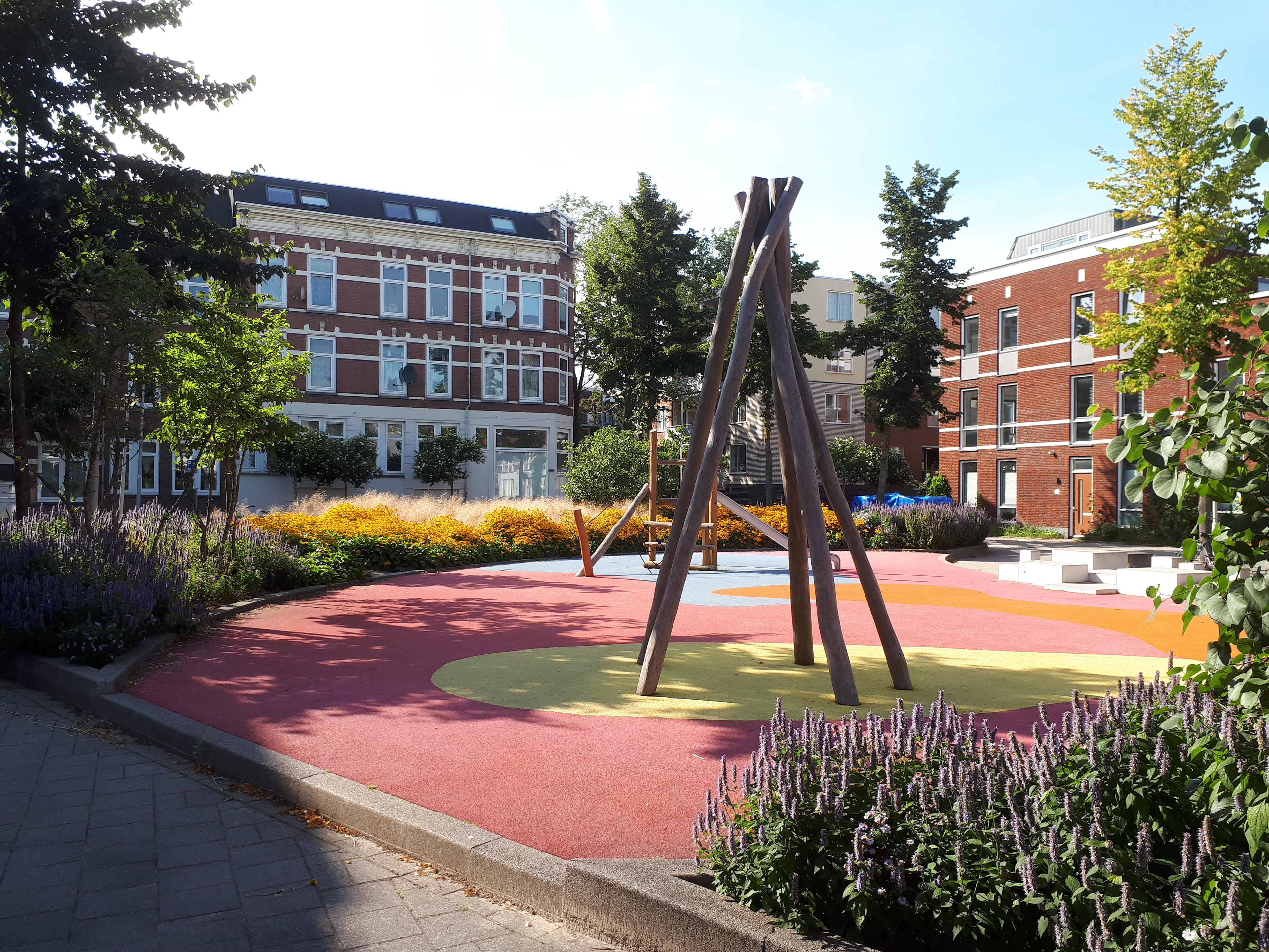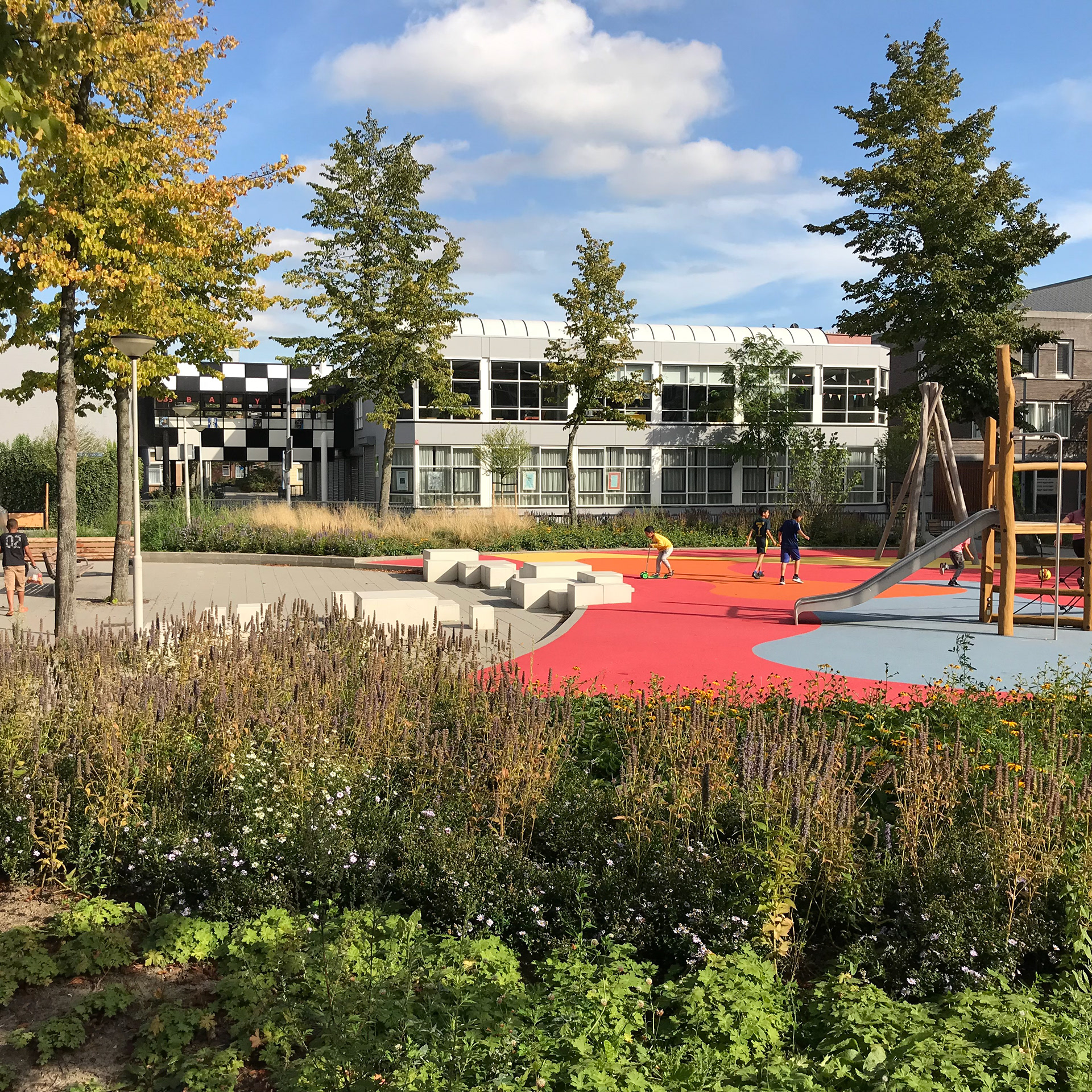 Het groen heeft de overhand, sierlijk en robuust tegelijk. Een speeplplek als een kleurrijke oase voor de allerkleinste kinderen. Met speelblokken en een verhoogde rand als speelaanleiding eromheen. De blokken van beton hebben verschillende hoogtes en grote. Hiermee kan het voor de ene leeftijdsgroep iets anders zijn dan voor de andere. In de visie over de wijk is nu ruimte gemaakt om de pleinen ieder hun eigen karakter te geven, met de straten en de verharding als verbindend element.