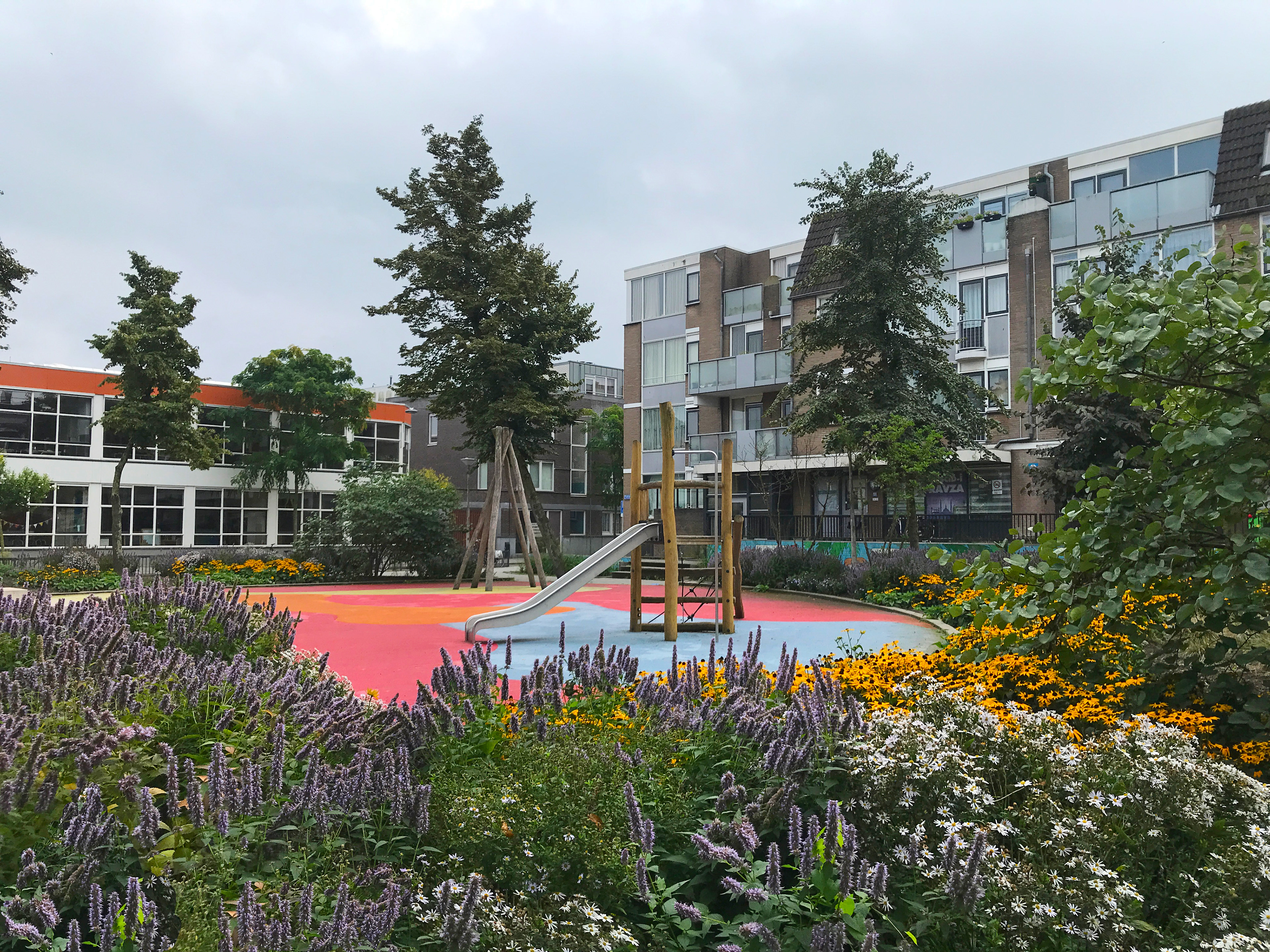Voor de beplanting op het plein is gekozen om met vaste planten en grassen te werken; kleurrijk en uitbundig. Het bomencarré is opgebroken door een aantal gezonde en grote bomen te behouden en hier bloesem bomen aan toe te voegen. Samen met de mix van de bomen in de straten en de andere beplanting introduceren we hiermee de seizoenen in de wijk. De transitie van stenig kaal plein naar een groene organische oase kan nu werkelijkheid worden.