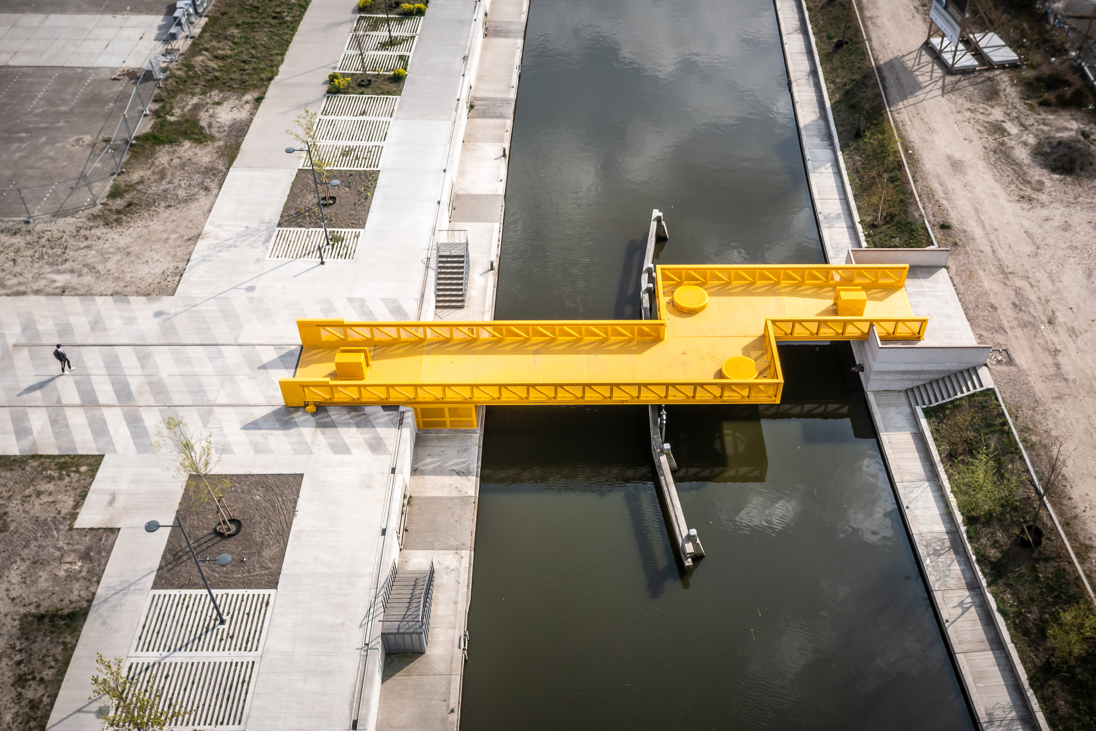 Door maximaal gebruik te maken van standaard profilering en beplating wordt de stoere geometrische beeldtaal van de rolbrug versterkt; ongepolijste, industriële poëzie met oog voor de gebruiker. Want juist voor de passant zijn techniek, mechaniek en materialiteit helder afleesbaar en dragen bij aan de identiteit van brug en plek.
