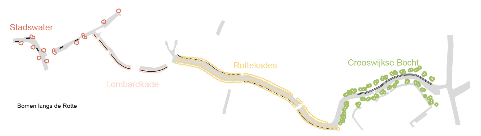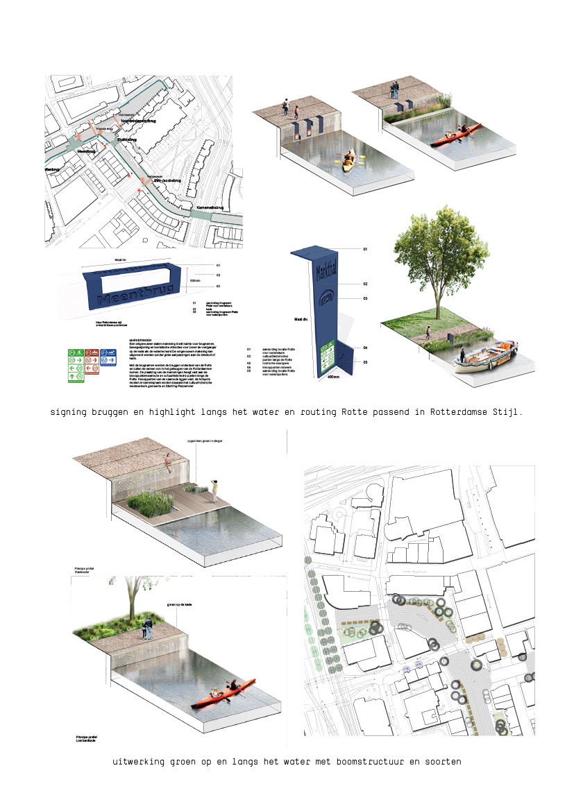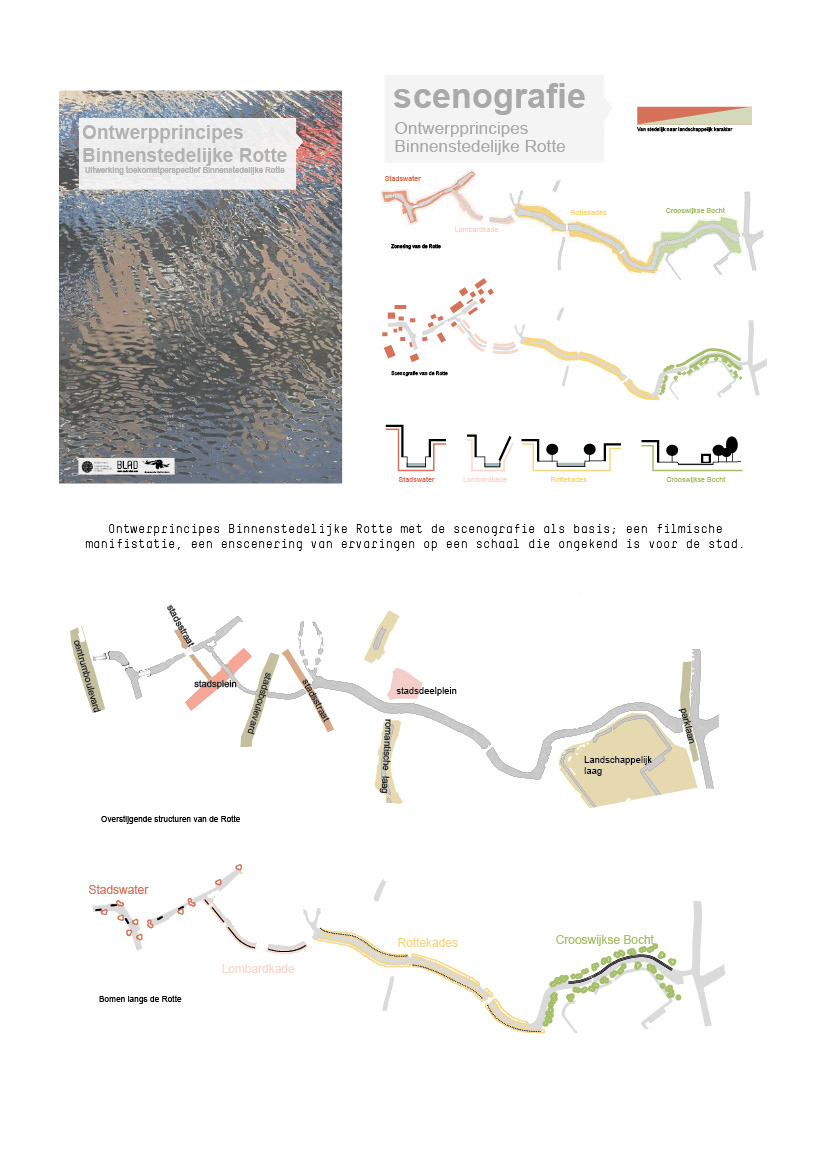 Werkend vanuit 4 ambities; versterken van de kwaliteit en kwantiteit, continuïteit routing langzaam verkeer, verbeteren bevaarbaarheid en vergroten van de ecologische waarden. Is gekozen om als aanvulling op de landschappelijke onderlegger vanuit het toekomstperspectief, deze uitwerkingen te bezien vanuit de scenografische kwaliteiten/ karakters van de Rotte. De scenografische indeling van de Rotte is de basis waar vanuit de groen, verharding en kunstwerken als themakaarten volgen.
