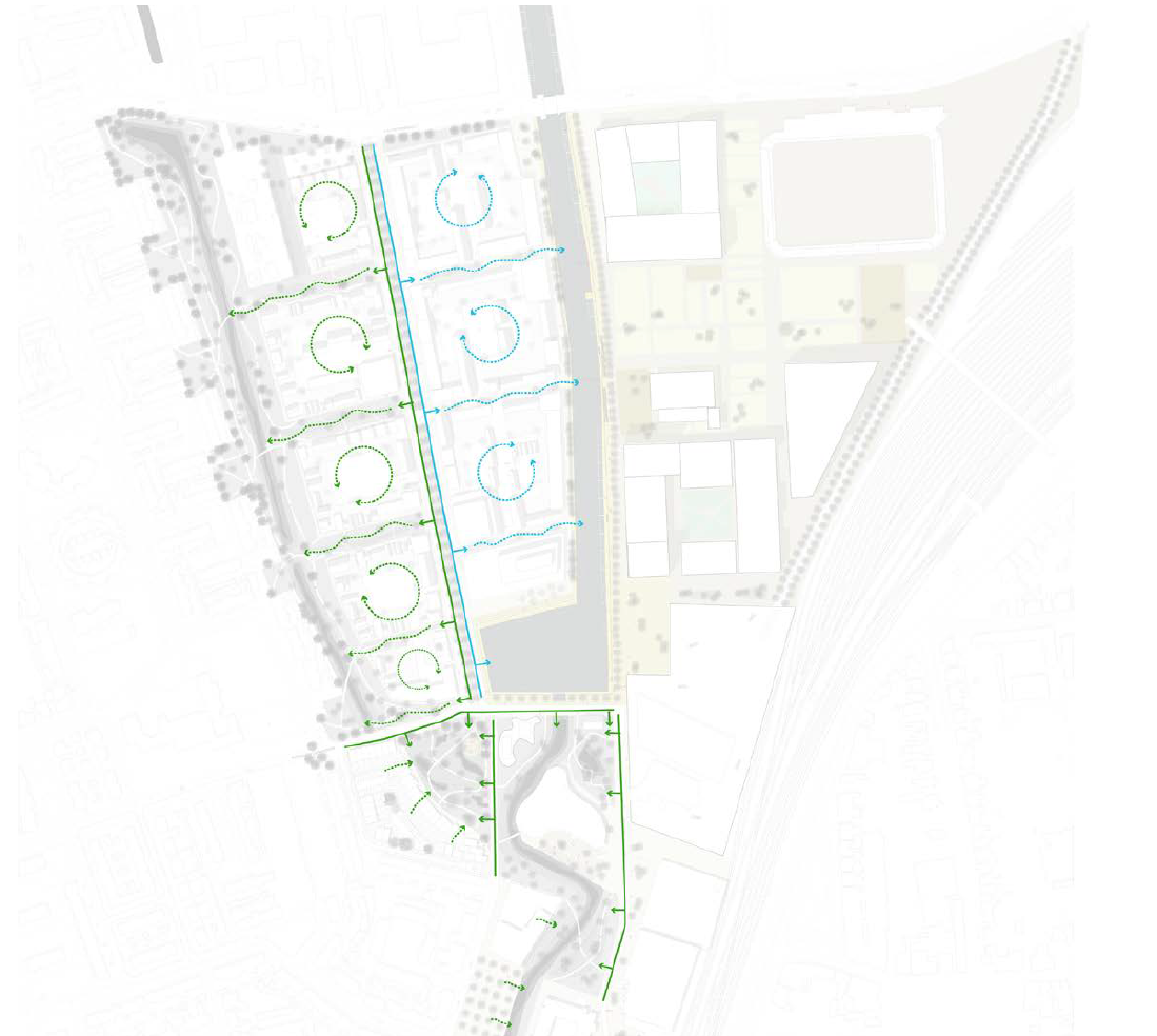 Stadsoevers wordt gebouwd op zijn natuurlijke onderleggers; De Molenbeek, Oude Beek en de Roosendaalse Vliet. Deze structuren blijven zichtbaar in het stedenbouwkundig plan. Met zichtbaar afvoeren, als belangrijk onderdeel van de nieuwe woonwijk. Krijgt de wijk een robuust systeem gekoppeld aan de natuurlijke onderleggers. Het westelijke deel groen en ontspannen wonen met wadi's en open goten naar de beek toe. Het oostelijk deel meer stedelijk karakter met kadewoningen en bouwblokken, waar de straten en groene binnenwerelden via goten en wadi in de stegen naar de vliet worden geleid.