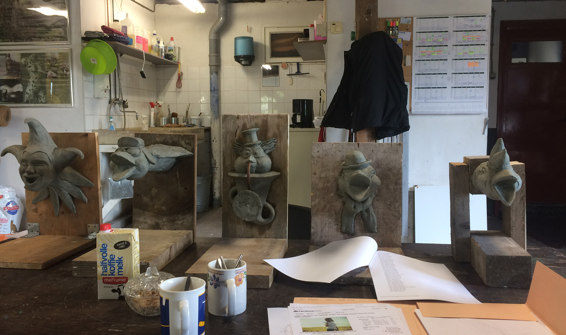 Ze vertellen het verhaal van carnaval als symbool de Tullepetaon. Samen met Leon Vermunt, de kunstenaar van de grote Tullepetaon op de Markt hebben we deze 11 (gekkengetal, raad van elf, de elfde van de elfde) ontworpen met elke spuwer zijn eigen thema of onderwerp. De elf parelhoenen spuwen het oppervlakte water uit de wijk de Vliet in, een feest bij slecht weer. Maar ook een bijzondere ontmoeting tijdens een wandeling langs de vliet of al varend.