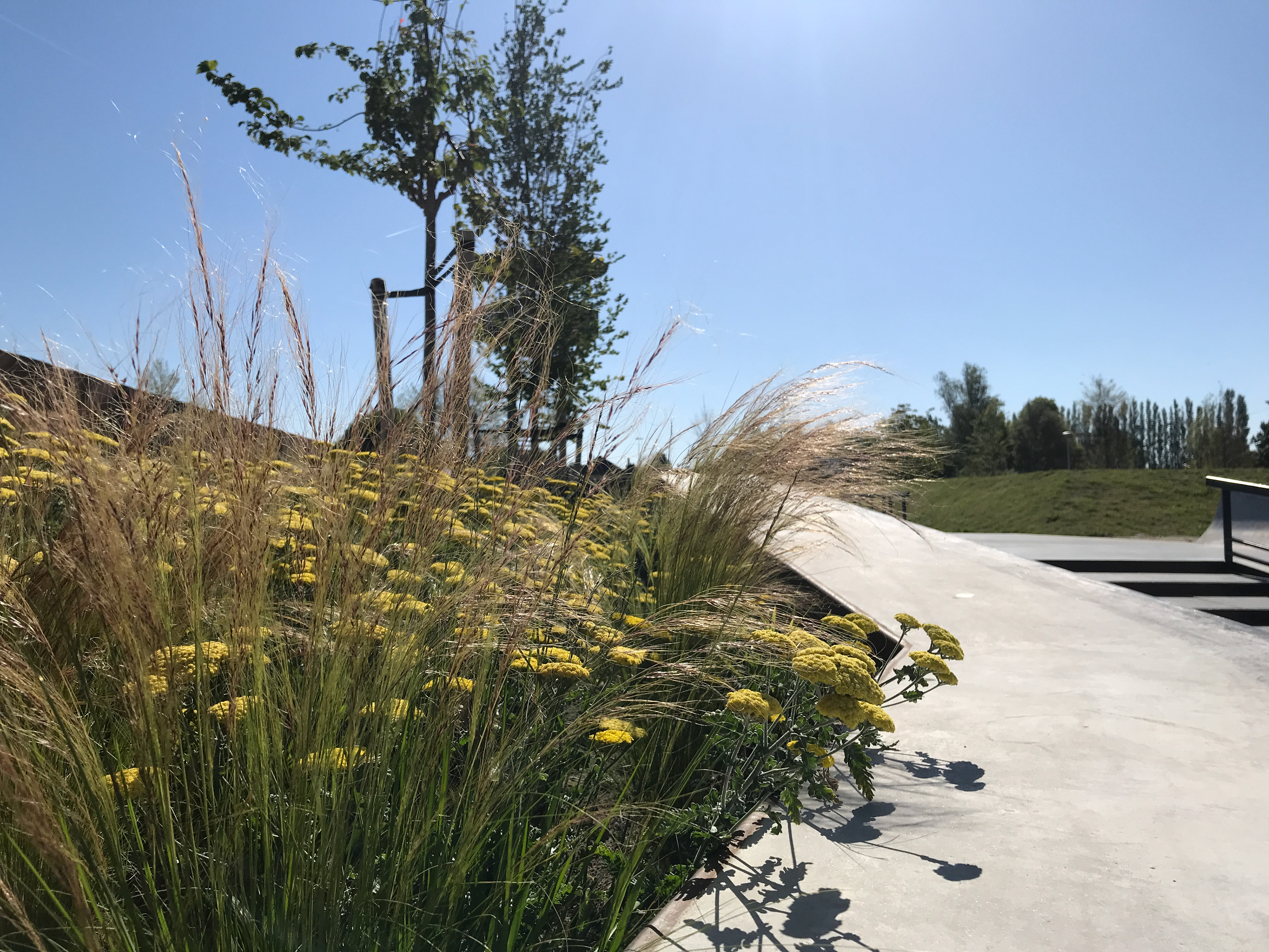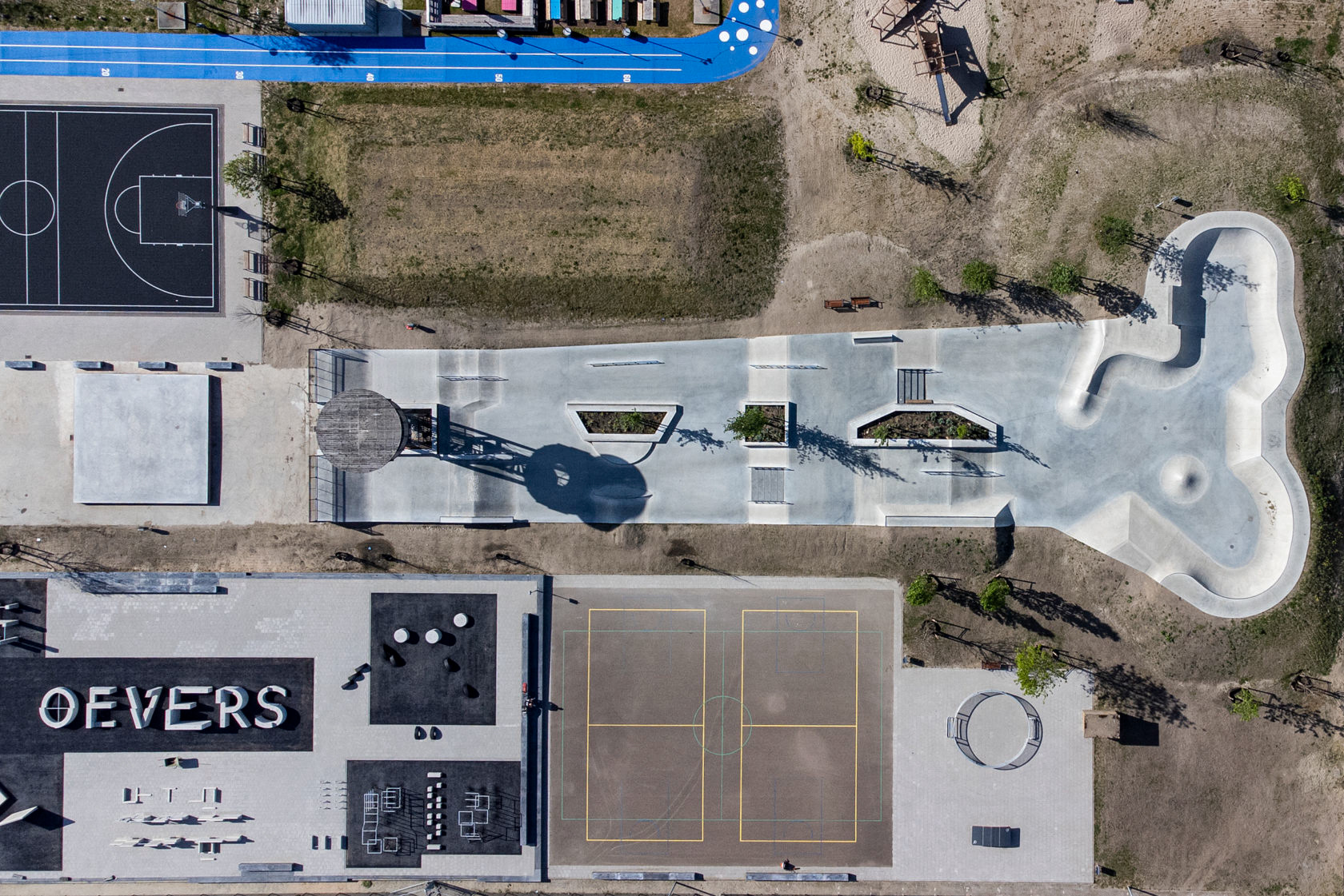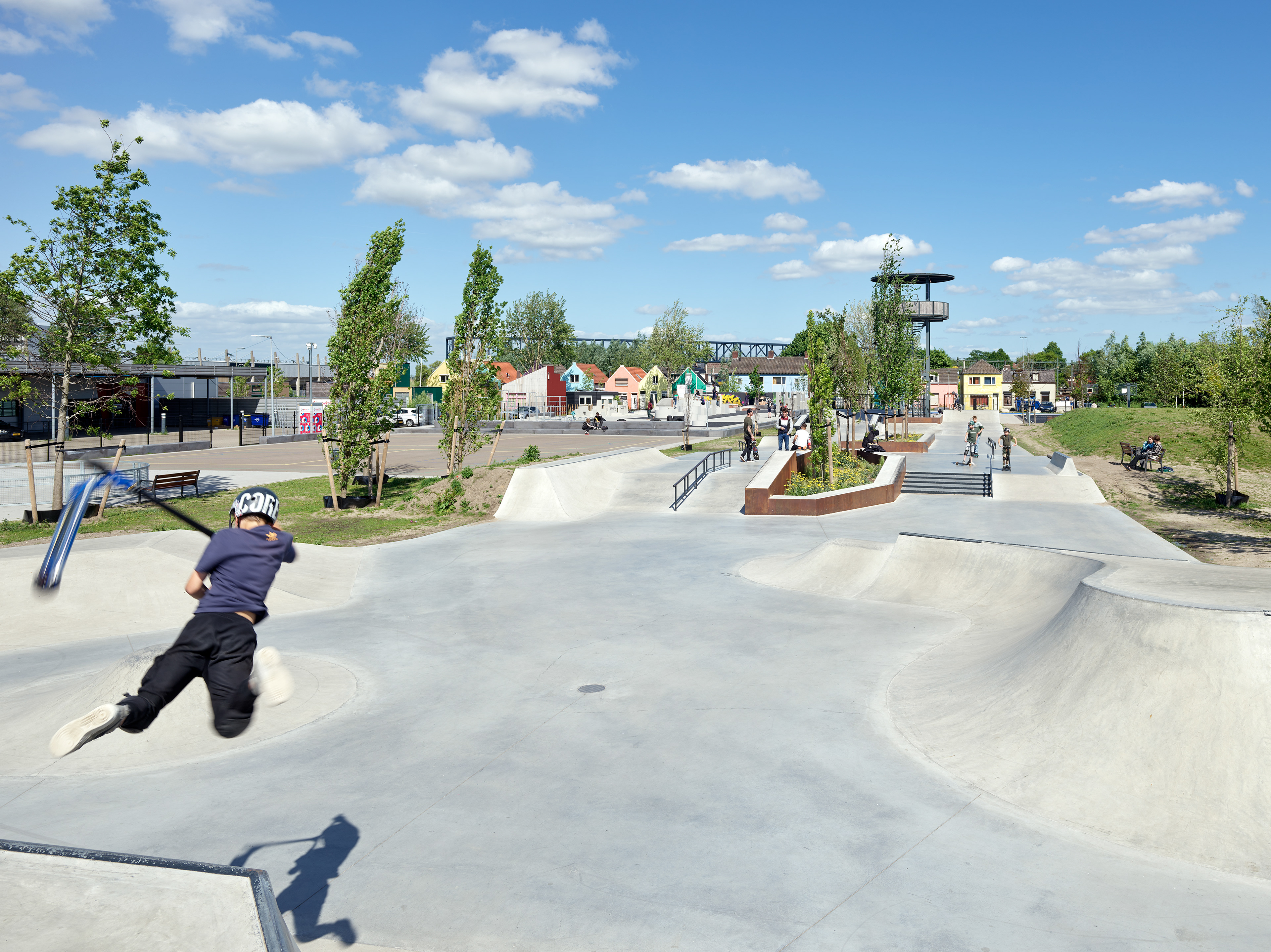 Een tweede leven voor de toren hier centraal rondom de urban sporten. Eerst een uitkijkplek in Waddinxveen, nu de perfecte view over het hele park en de ontwikkeling van Stadsoevers. Het skatebaar landschap hebben we met skaters, steppers en Nineyards Skate ontwerpen. De langgerekte vorm van het skatepark komt voort uit de bestaande betonvloer van de oude staalloods. Het groen verzacht de betonbaan en maakt verschillende runs mogelijk en biedt veel ruimte voor skaters. Naast skate, freerun en breakdance is ook 3x3 basketbal als nieuwe sport toegevoegd tot de olympische sporten.