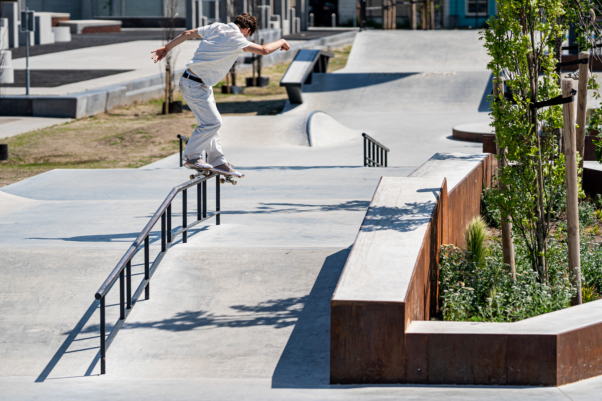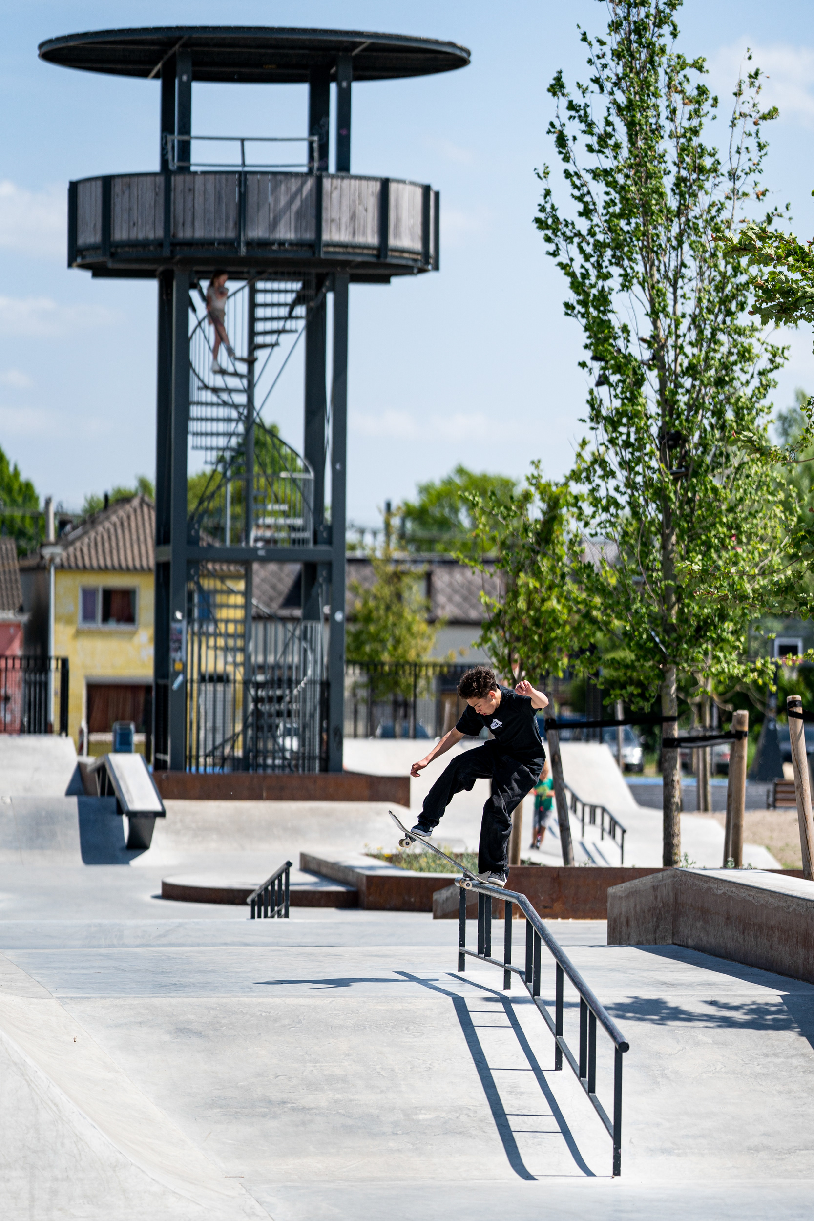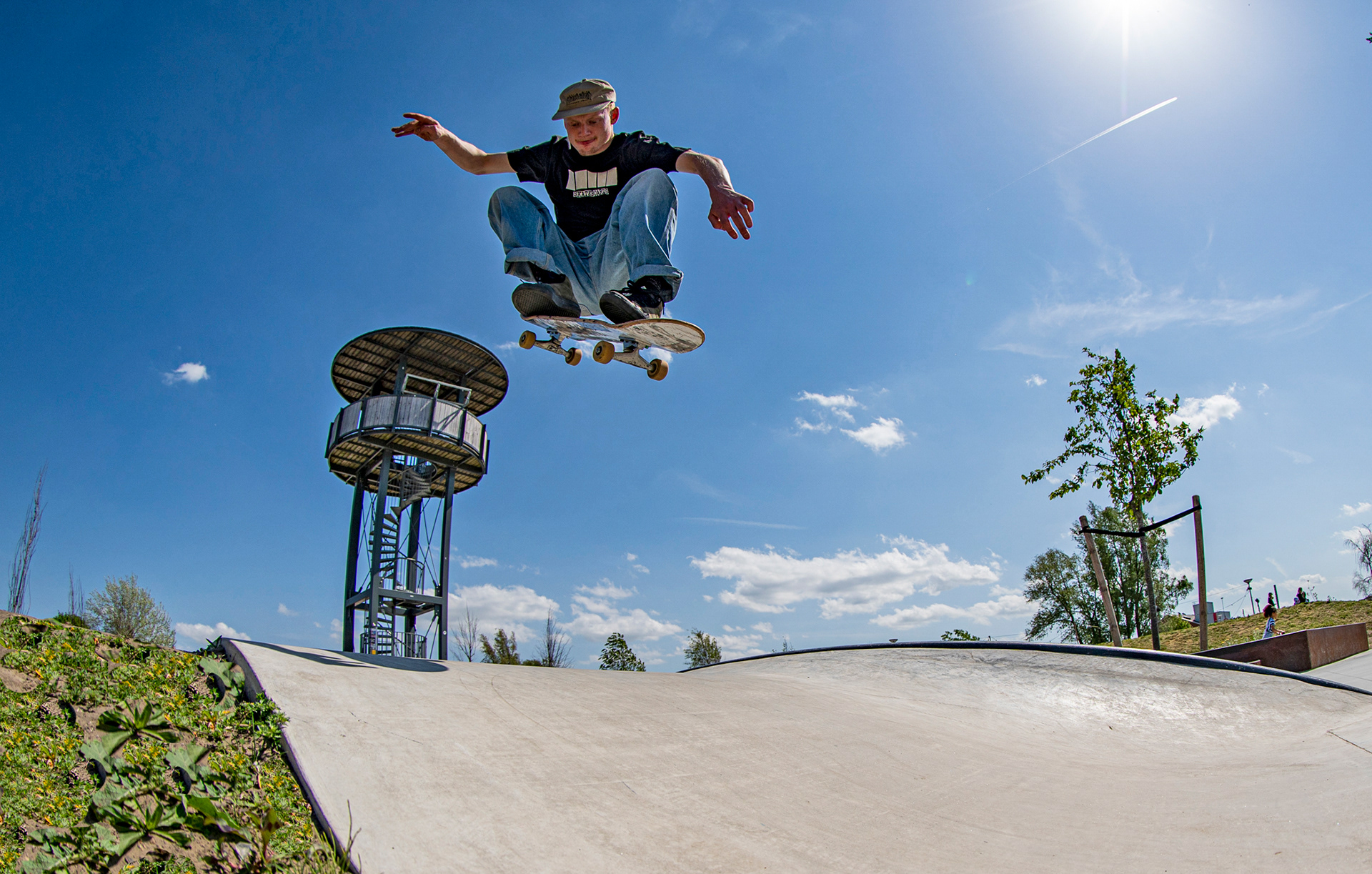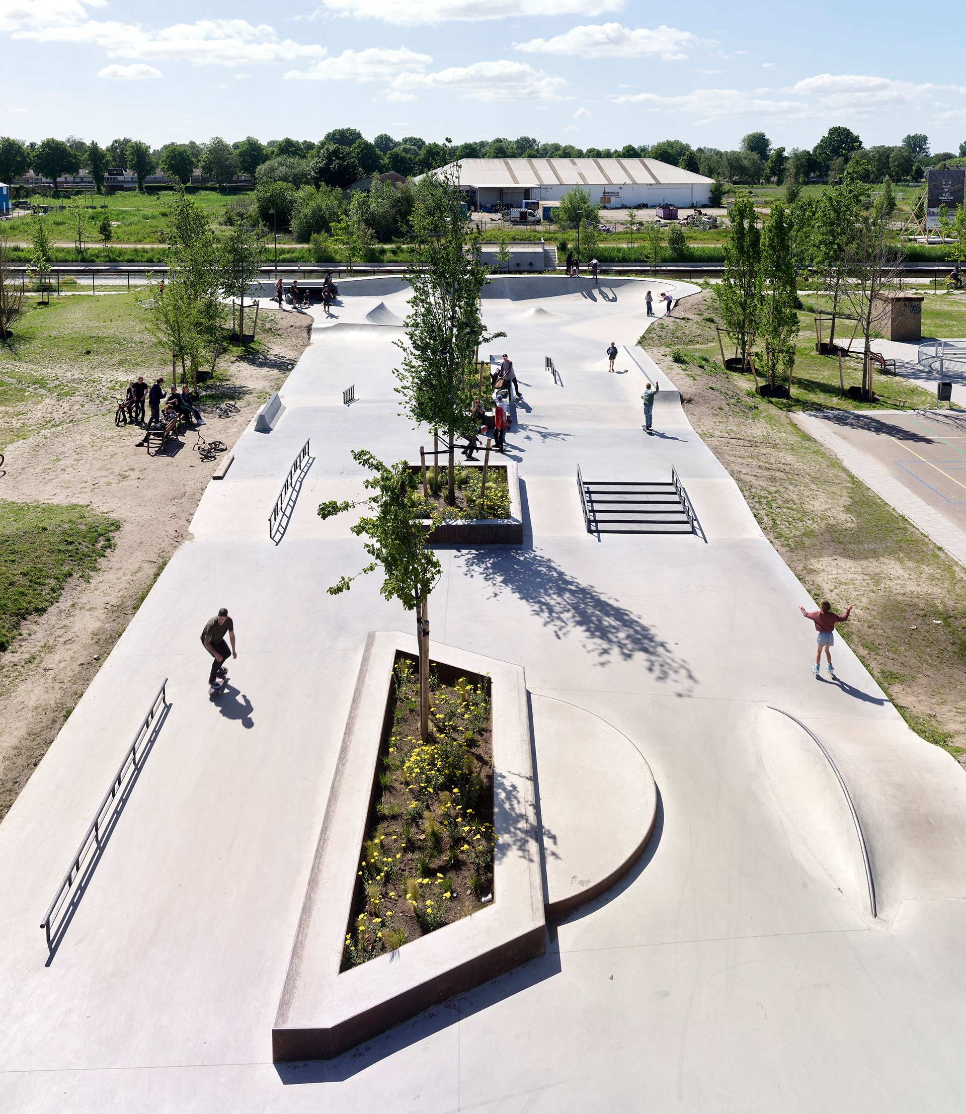 Een tweede leven voor de toren hier centraal rondom de urban sporten. Eerst een uitkijkplek in Waddinxveen, nu de perfecte view over het hele park en de ontwikkeling van Stadsoevers. Het skatebaar landschap hebben we met skaters, steppers en Nineyards Skate ontwerpen. De langgerekte vorm van het skatepark komt voort uit de bestaande betonvloer van de oude staalloods. Het groen verzacht de betonbaan en maakt verschillende runs mogelijk en biedt veel ruimte voor skaters. Naast skate, freerun en breakdance is ook 3x3 basketbal als nieuwe sport toegevoegd tot de olympische sporten.
