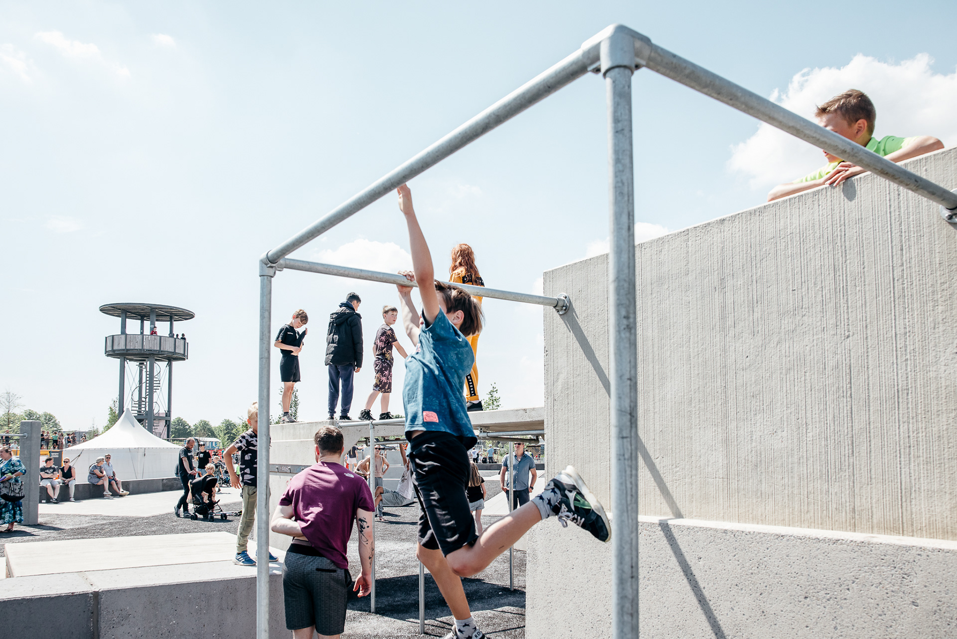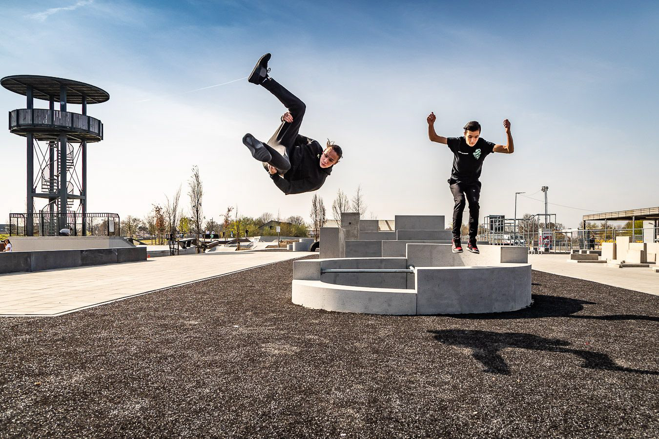 Het freerunveld is in samenwerking met Trickz Foundation en de freerunningscobra’s ontstaan en deels is opgebouwd uit oude heipalen/damwanden en steigermateriaal. Er zijn verschillende soorten freerunplekken gecreëerd met voor ieder niveau iets aantrekkelijks. En ruimte met zitplekken langs het veld voor de sporters of leerlingen.; ideaal als buiten klaslokaal. Net als het multi-veld met lage tribune. Het opgetilde vlak naast het freerun kan dienen als breakdancevloer, maar ook als podium tijdens een festival.