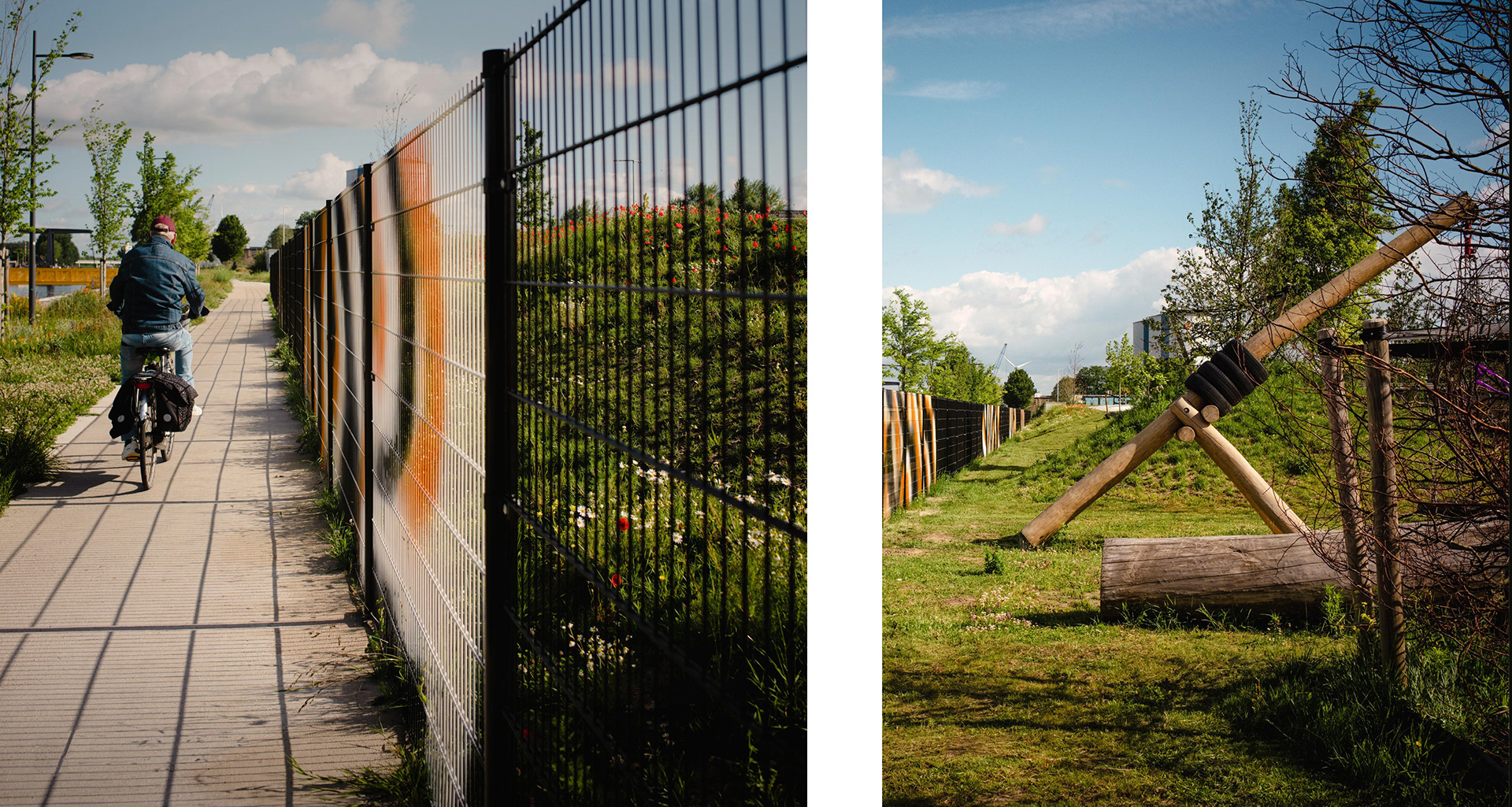 Het park wordt afgesloten met een simpel, minimalistisch hekwerk. Langs de Vliet is dit hekwerk voorzien van een dynamisch kunstwerk door Tom Onrust, passend bij de beweging van de Vliet als het urban sportpark.