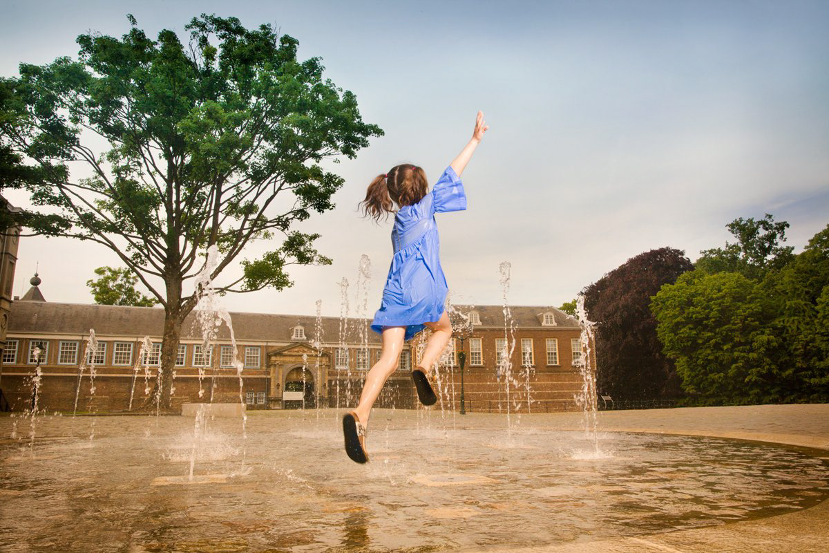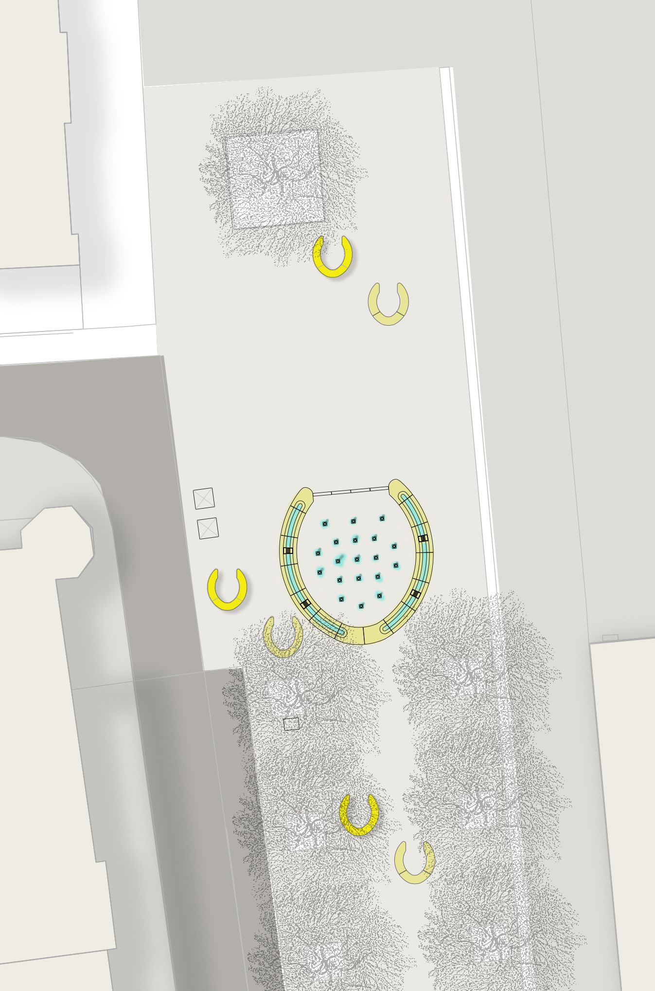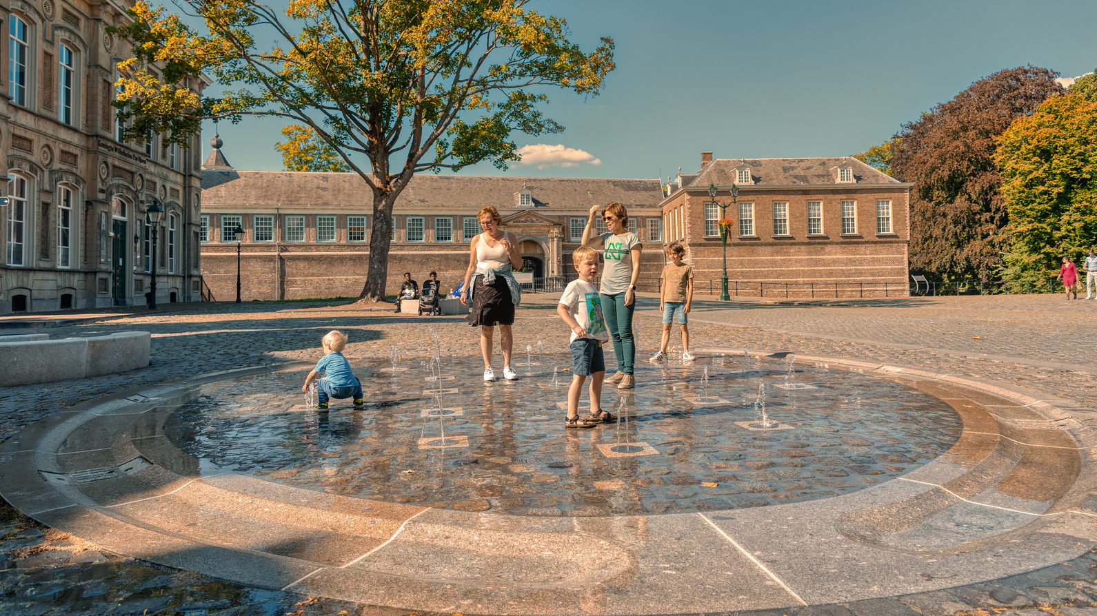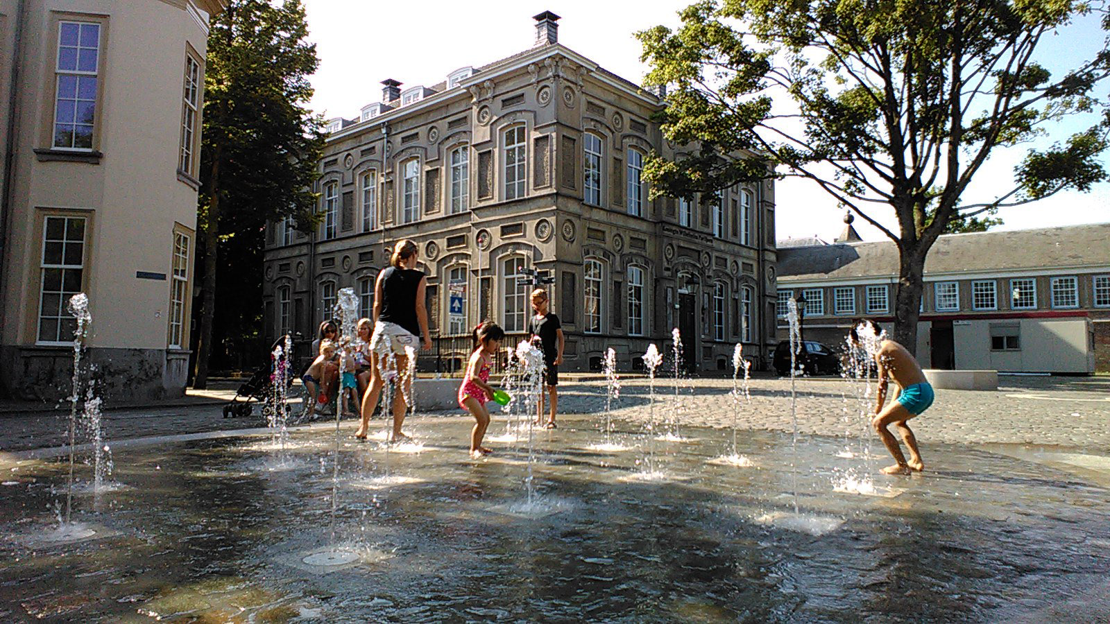 Een waterspeelplek en zitelementen die samen een geheel vormen, uit de verharding springen door hun kleur en materiaal. Het verhaal van de plek wordt zichtbaar en de verbinding van kasteel, beeld en centrum wordt gelegd. De zitelementen kunnen door hun vorm ook op veel verschillende manieren gebruikt kunnen worden. Ze staan soms dichtbij de spuiters, of juist iets verder weg mooi in de middagzon, of in het rustige middendeel. Van een plein waar je vooral overheen liep naar de stad of station, is het nu met de toevoeging getransformeerd naar een plek voor verblijf. In de zomer een drukte met spelende kinderen en ouders zittend op de hoeven.