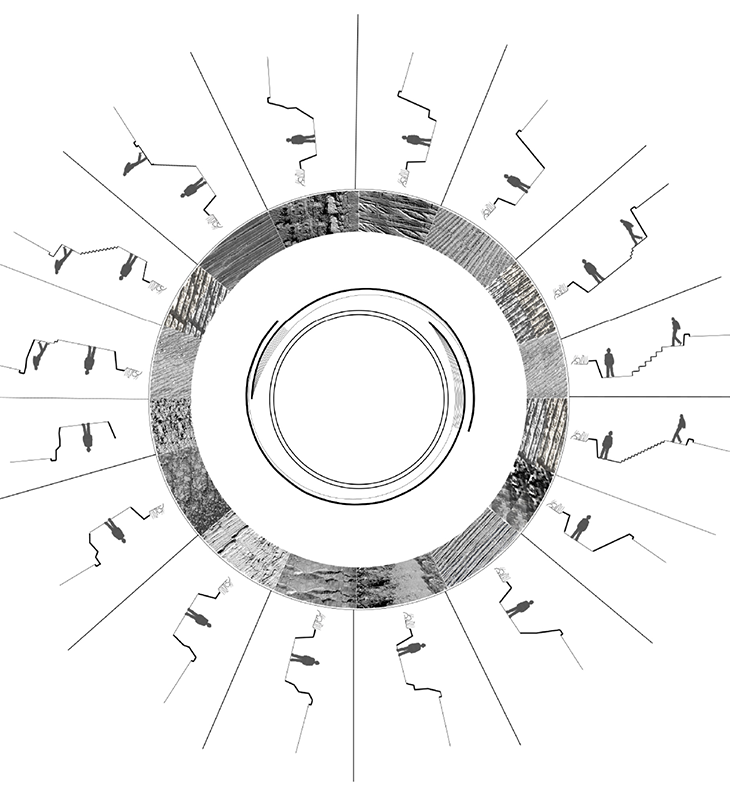 Vanuit de 'loopgraaf' kan men de 'vijand' bespieden en tijdens het wandelen op het middendeel voelt men continu de blik van zowel de andere bezoekers beneden in de ring als boven in het parkdeel. Een plek waar contemplatie en ongemak bij elkaar komen.